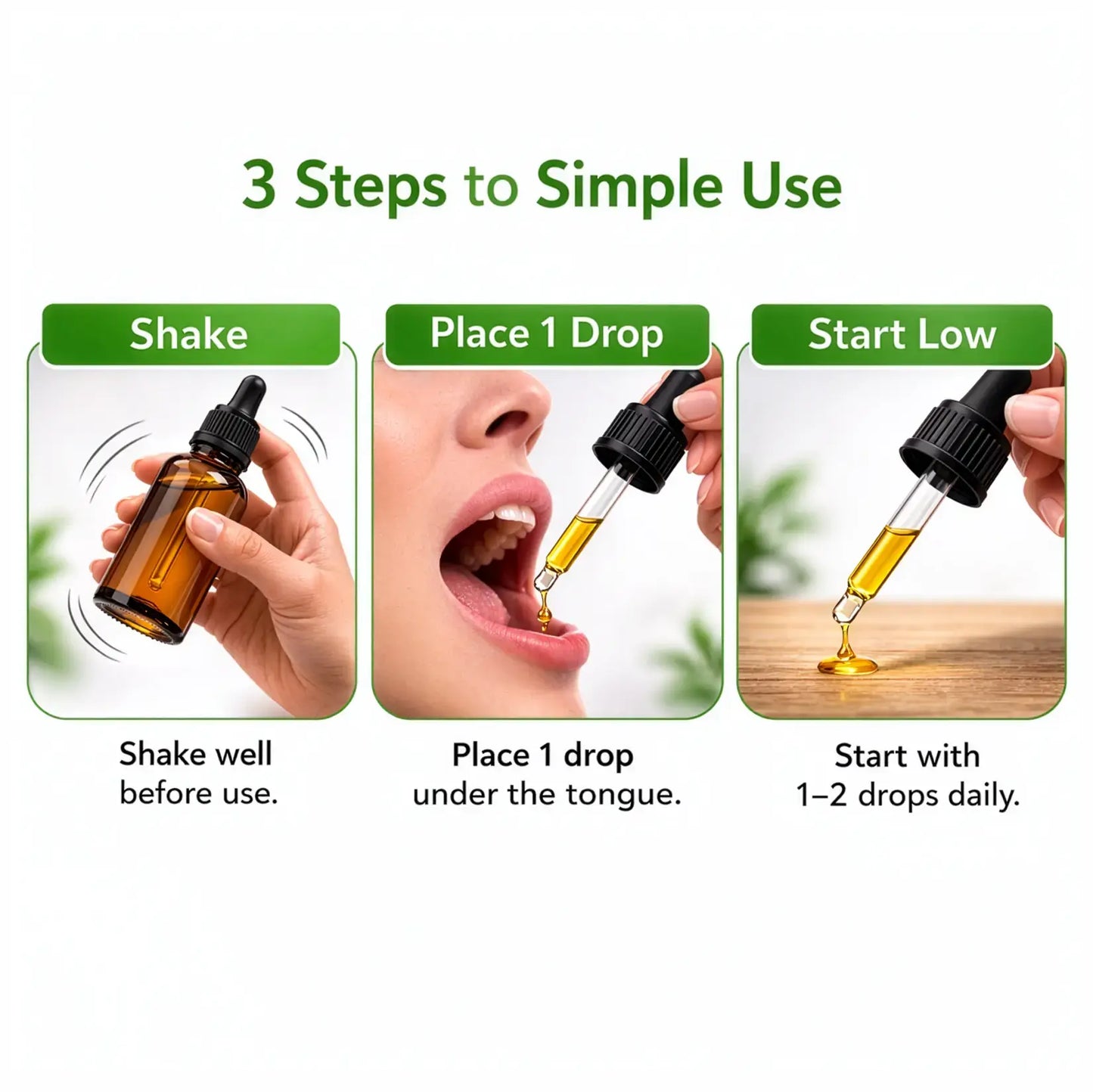 Place 1 drop under the tongue, hold for 60–90 seconds, then swallow.